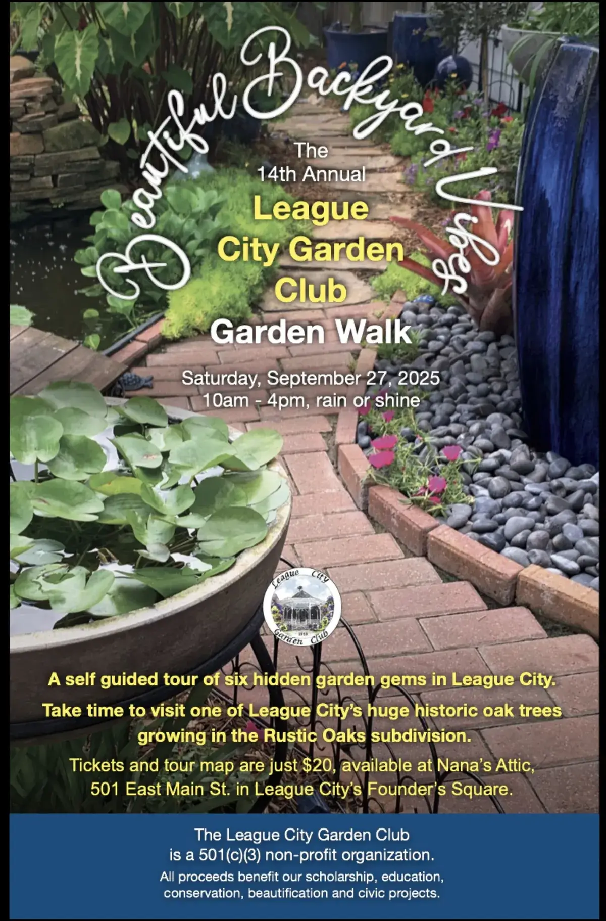League City Garden Club Announces their 14th Annual Garden Walk “Beautiful Backyard Vibes”.Peek at some of the most beautiful hidden gardens in League City as the League City Garden Club invites you to attend the club’s 14th Annual Garden Walk, “Beautiful Backyard Vibes,” Saturday, September 27, 2025, from 10am to 4pm.
